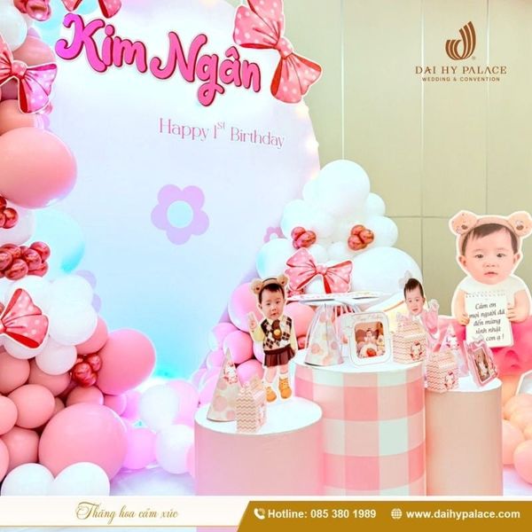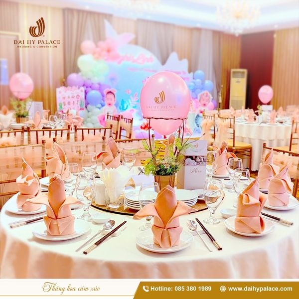 Bên cạnh đó, layout decor cũng cần mang hơi hướng hiện đại với backdrop thanh thoát, điểm xuyến hoa tươi và hệ thống ánh sáng ấm, giúp tổng thể bữa tiệc mang chút ấm cúng của gia đình mà vẫn toát lên sự chỉn chu như tại nhà hàng. Tại Đại Hỷ Palace, đội ngũ decor luôn điều chỉnh từng chi tiết để phù hợp cảm xúc chung của buổi tiệc, đảm bảo ai bước vào cũng cảm thấy dễ chịu và “thuộc về”.